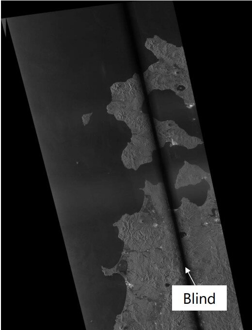 ① Regarding the unobservable area (blind) Regarding the ALOS-4/PALSAR-3 data, there is data that has a blind area as shown in the figure below. Regarding observation data in Japan, we describe the presence or absence of unobservable areas on the PLATFORM as much as possible, but there is currently no information necessary to determine the observations in overseas areas, and it is not possible to confirm the presence and location of unobservable areas in the data until you purchase the data.